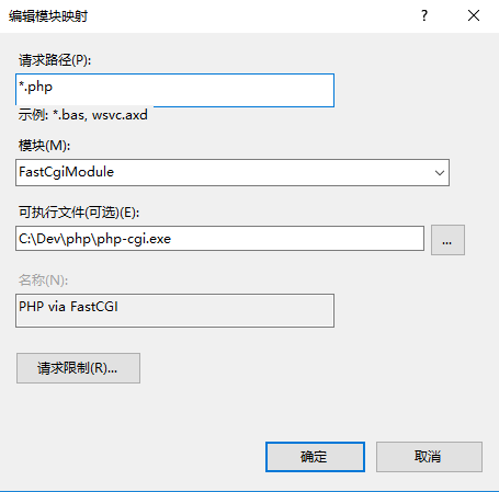 关于FastCGI:选择 Default Web Site,点击功能区里边的处理程序映射,添加模块映射。