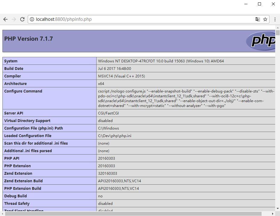 在网站默认/指定路径下,放一个内容为<?php phpinfo(); ?> 的文件,可以命名为 phpinfo.php。启动或重启 IIS 服务,默认路径输入 localhost:8800/phpinfo.php,指定路径(如放在了虚拟目录下)输入 localhost:8800/虚拟目录别名/phpinfo.php,显示下图即为 IIS + PHP 组合成功