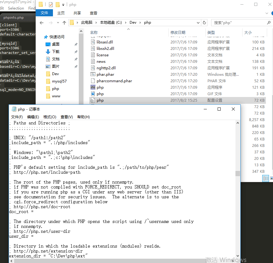 php下载 Non Thread Safe 或 Thread Safe 都行,暂时不清楚有什么具体运行时的区别。解压缩到指定文件夹,按照网上多如牛毛的“教程”复制 php.ini-development 或 php.ini-production 为 php.ini,并修改里边的 extension_dir 为 php 安装目录下的 ext 文件夹,如下图