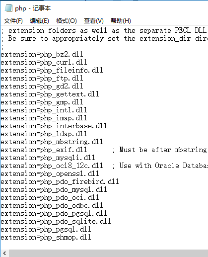 然后按照需要(截止到写文时,我暂不知道什么需要什么不需要)将 ;extension=xxxx 这样的扩展启用,启用方法就是去掉前面的英文半角冒号并保存。