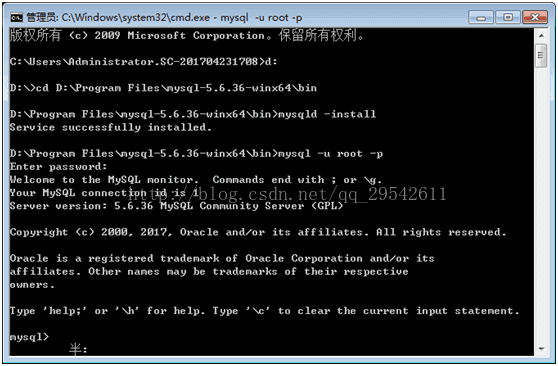 由于默认的用户名为root 密码为空 使用命令mysql –u root –p按回车提示输入密码直接回车就可以登录啦。到此mysql-5.6.36-winx64绿色版就安装成功。