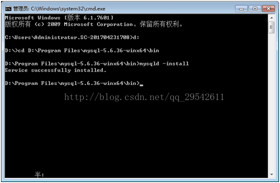 5、安装mysql服务 ,dos窗口切换到MySQL的bin 目录下 执行命令