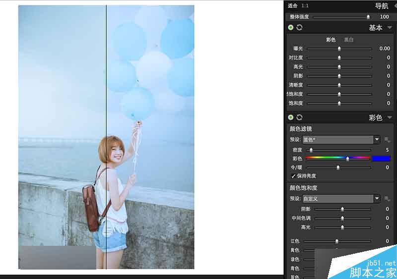 推荐一个比较实用的调色滤镜Alien Skin Exposure ,在颜色滤镜中选择蓝色滤镜进一步突出蓝色,密度根据自己喜好调整,至此不忧郁的清新蓝色已经调出。