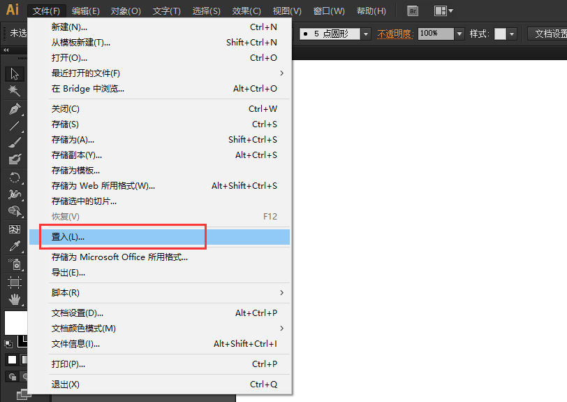 2、选中上面的“文件”选项,在下拉菜单之中,可以看到有一项是“置入”,请点击“置入”选项。