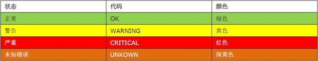 Nagios可以识别4种状态返回信息,即 0(OK)表示状态正常/绿色、1(WARNING)表示出现警告/黄色、2(CRITICAL)表示出现非常严重的错误/红色、3(UNKNOWN)表示未知错误/深黄色。Nagios根据插件返回来的值,来判断监控对象的状态,并通过web显示出来,以供管理员及时发现故障。