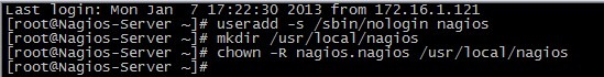 # useradd -s /sbin/nologin nagios# mkdir /usr/local/nagios# chown -R nagios.nagios /usr/local/nagios