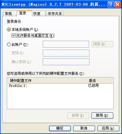 双击打开,点“登录”标签,在“允许服务与桌面交互”前打勾。