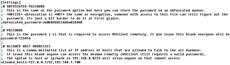 在[Settings]部分设置'password'选项来设置密码,作用是在nagios连接过来时要求提供密码。这一步是可选的,我这里设置为'123456'。