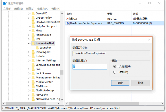 在右侧新建个“UseActionCenterExperience”的DWORD(32位)值,数值数据默认为0不用修改,就算是彻底屏蔽弹出的通知消息了。
