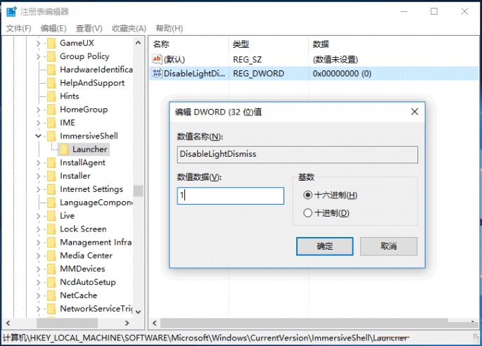 在右侧新建个名为“DisableLightDismiss”的DWORD(32位)值,数值数据设置为1。