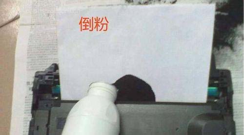 取下刮板之后把粉仓里剩余的粉清理干净,沾到鼓芯和充电棒上的粉也吹干净,拿半张A4纸从加粉口插进去,然后倒粉