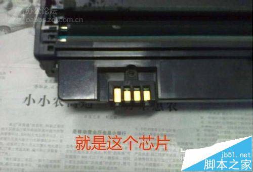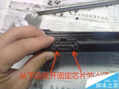 粉倒完之后照原样装好刮板和盖板,接下来换芯片,芯片也是被焊死在鼓上的一个塑料片盖着,不过很容易就能取下,抠开盖板,拿镊子夹出芯片,再把新的芯片放进去就OK了