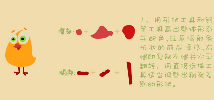 1、用形状工具和钢笔工具画出整体形态并配色,注意嘴部各形状的前后顺序,右脚即复制左脚并水平翻转,用直接选择工具适当调整出稍有差别的形状。