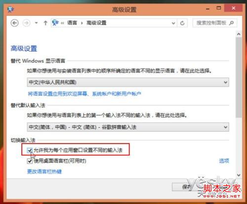 重点来了!在语言的“高级设置”界面中勾选“允许我为每个应用窗口设置不同的输入法 ”,点击“保存”按钮。 这里的“不同的输入法”不仅指完全不同的两种输入法,也包括一种输入法的不同语种(中/英)输入状态。