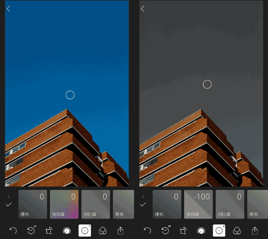 我们降低饱和度至最低,因为我们的圆圈是放在天空,所以说只有天空变成黑白了,建筑物没有改变。