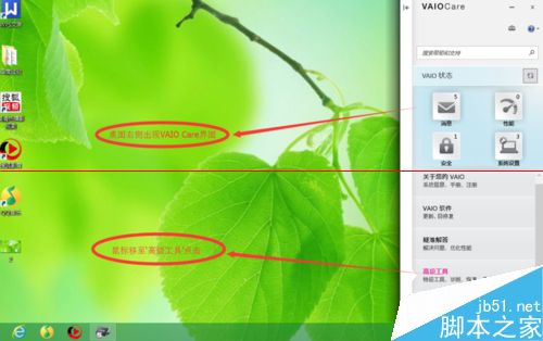 3、VAIO Care页面在桌面右侧出现,将鼠标移至‘高级工具’-点击。