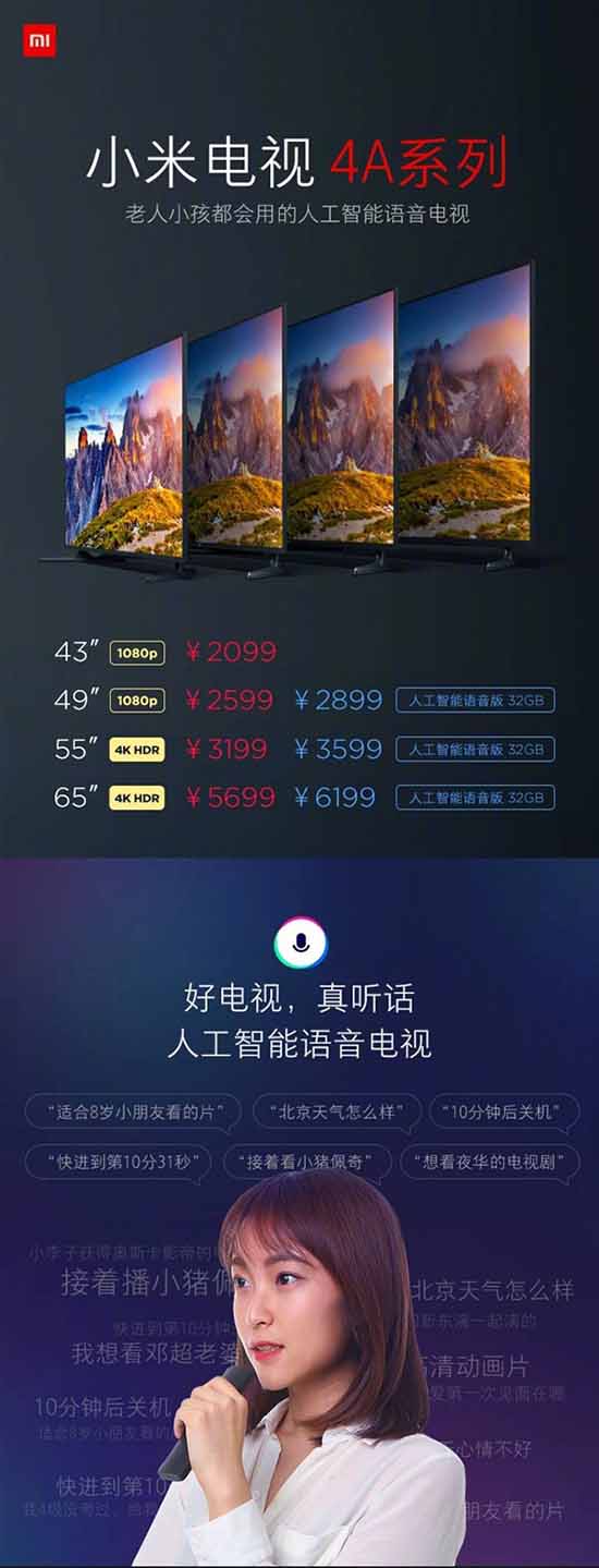 - 65寸4K HDR标准版5699元,人工智能语音版32GB 6199元