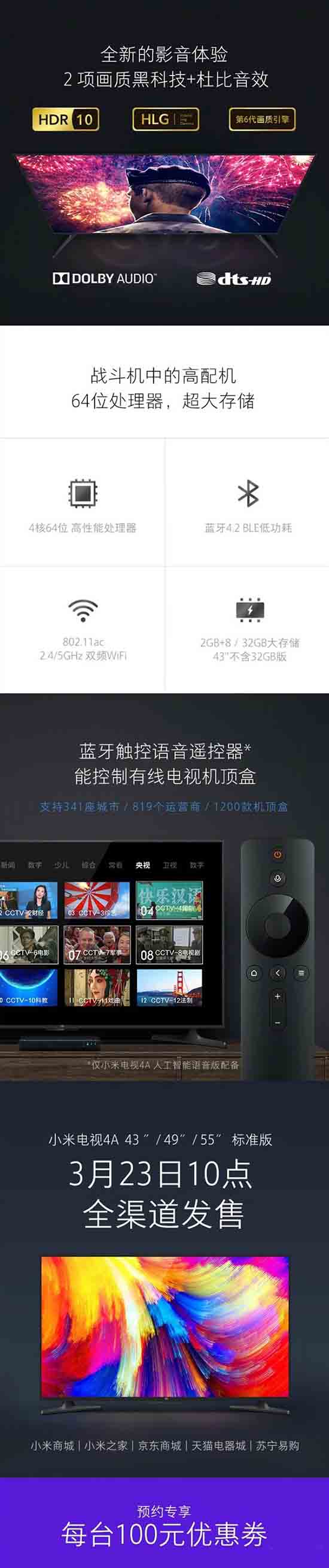 其中,43/49/55寸标准版将于3月23日上午10点全渠道发售,其他待定。