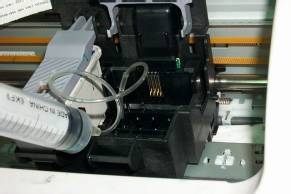 ④如浸泡未能完全清洗好,将字车移出清洁单元,用灌了打印头清洗液的注射器套软管(也可用胶皮气门芯),在打印头進墨柱上轻抽,抽不动说明打印头中有堵。这时打印头中是负压,轻抽一下,停一下,清洗液就会逐渐進入打印头,一般在抽大约7、8次后都能抽动。