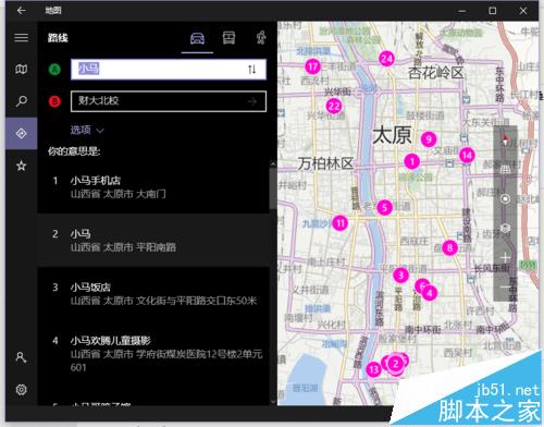 10、小编选择太原,点击确定后,发现地图已经有了变化了,然后点击像书一样折叠的图标就可以隐藏左边的那一菜单栏,转心看地图了;小编瞅了瞅,地图还是蛮新的,可以放心使用;小编发现了个不足之处,填写上起点终点搜索效果令小编还是非常不满意滴,具体请看图就好了;不过在没有网的情况下有这张地图可用还是不错的。