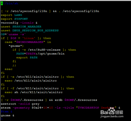 5、上一步执行完毕会在root宿主目录下生成.vnc开头的隐藏目录,该目录下面的文件就是root用户的VNC桌面配置文件。打开xstartup配置桌面