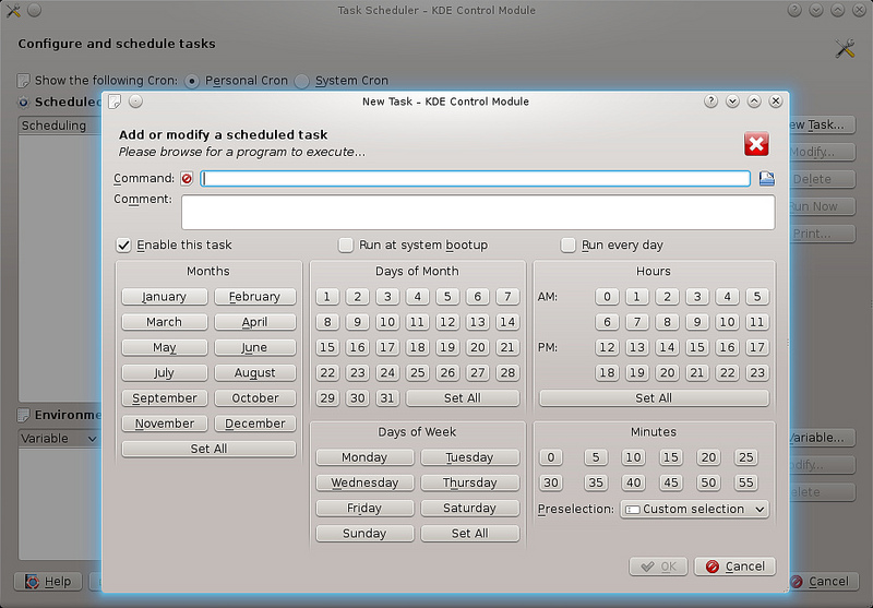 在KDE桌面中,有一个Task Scheduler(kcron包)。