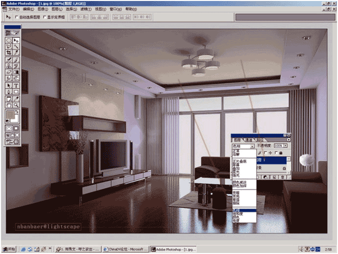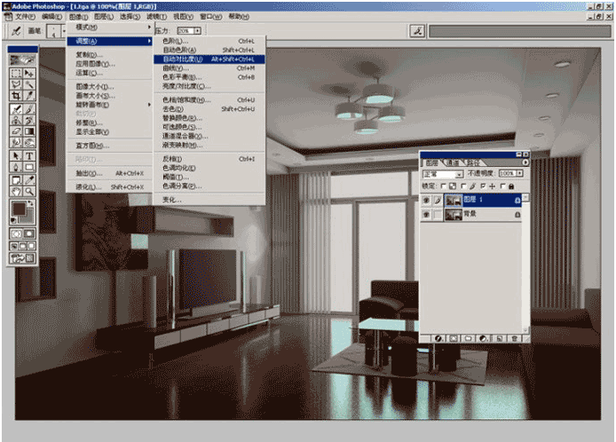 先建議大家在原有毛坯圖的基礎上複製一個同樣的圖。為什麼這麼做?因為我們在用3d軟體的時候,由於個別的原因做的圖可能燈光有暴圖的,或者我們的毛坯圖 的照度剛剛好,不需要太多的調整,而對比度的調整有提亮的作用,如果在一個層上調整,可能暴光的地方更暴。如下圖所示,複製的底圖(圖層1)是我們要操作 對比度的圖層。