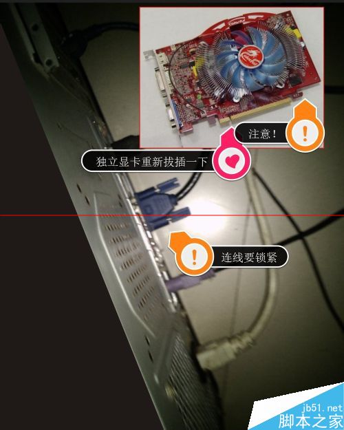 4、如果显示器电源灯亮但不显示,如果是独立显卡的主机,那把独立显卡重新拨插一下,如果对电脑不是很懂不知道独立显卡是什么样的话!?(独立显卡就是连接线主机内的卡(如图)通过连接线接显示器