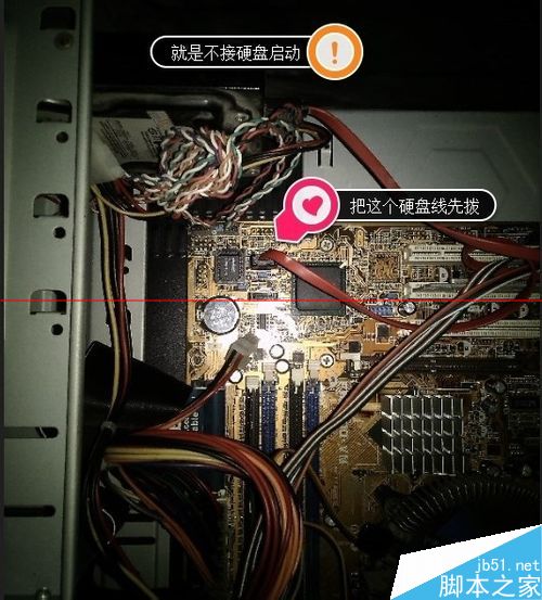 8、换上连线也不行,弄了大半天了,这下晕了!后面仔细看一看,想一想会不会是电脑检测不到一些配件(硬件)呢??????(这个要重点注意),发现键盘灯都没亮(键盘是好的),电脑是集成的显卡又不能拨插,怎么样都能使电脑重新检测硬件呢?问题找到了就好办了,我们可以把电脑的硬盘线拨了(就是不接硬盘启动),因为电脑没有硬盘就会重新检测硬件的(这个要重点注意)