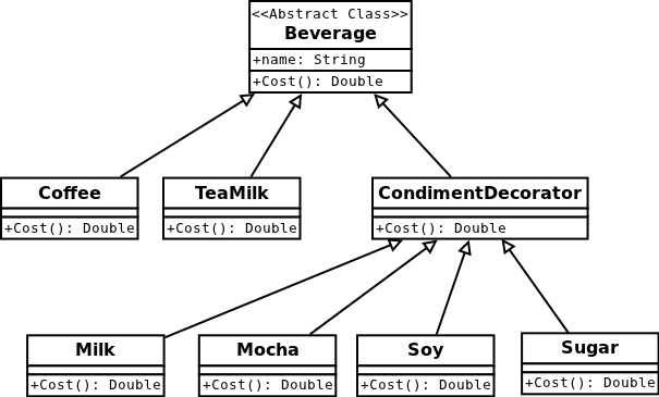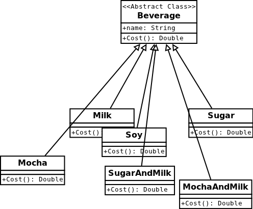 有这样一个项目,做一个餐厅订餐系统。起初的代码结构是这样的。前面有很多Beverage的继承类,现在遇到的问题是牛奶的价钱上涨了,那么所有相关的类,我们都要进行调整,比如Milk,SugarAndMilk类,这种类还有很多,我们需要逐个去修改类中的方法——开发人员每次都做这种事情,要疯了!所以我们要改变现有的结构。以下的图都是简图,实际的图,可没有这么简单。