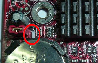 排除方法:仔细检查主板的CMOS跳线,是否正常设置在1-2位置。如果无法正确判别CMOS插针的位置,我们可以通过观察CMOS跳线边缘有无白色的宽线,如下图所示,一般情况下有线标记的即是第1脚。