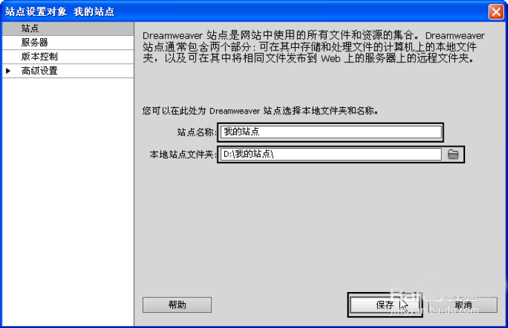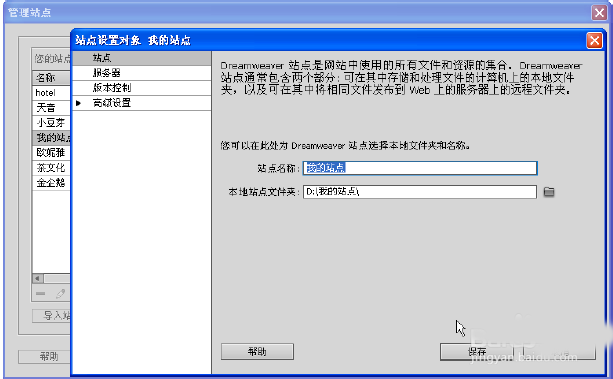2、在弹出的“站点设置对象”对话框中,设置“站点名称”为“我的站点”、“本地站点文件夹”为步骤1创建的文件夹,然后单击“保存”按钮,这时站点便创建成功了。