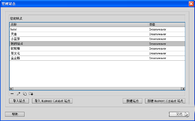 3、要打开站点,可在dreamweaver中选择“站点/管理站点”命令,弹出“管理站点”对话框,选择要打开的站点后单击“完成”按钮。