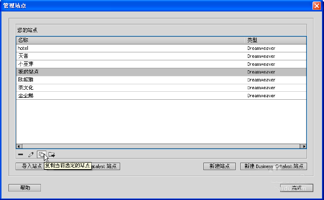 5、要复制站点需先在“管理站点”对话框中选择要复制的站点,然后单击“复制当前选定的站点”按钮,在站点列表中即增加了一个新的站点“我的站点 复制”,表示这个站点是“我的站点”的副本。双击复制的站点可对其进行编辑。在“管理站点”对话框中单击要删除的站点,单击“删除当前选定的站点”按钮即可将其删除。