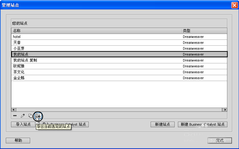 6、我们可以将站点导出为一个站点文件用于备份,待站点出现问题时将备份文件导入为一个站点,及时恢复。要导出站点首先在“管理站点”对话框的站点列表中单击要导出的站点,然后单击“导出当前选定的站点”按钮。