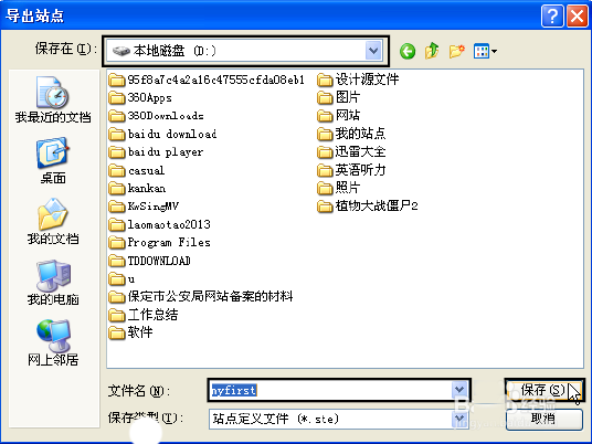7、在弹出的“导出站点”对话框中为导出的站点文件命名,然后单击“保存”按钮。要导入站点可在“管理站点”对话框中单击“导入站点”按钮,在弹出对话框中选择要导入的站点文件(扩展名为.ste),单击“打开”按钮即可。