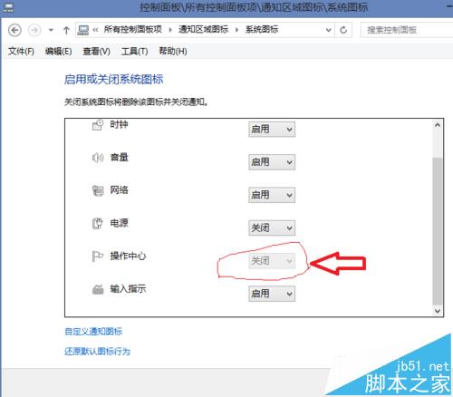 3、在这里可以把:操作中心,在通知区域显示。有的电脑后面会显示是灰色无法调整。这是因为在策略组里关闭的原因。