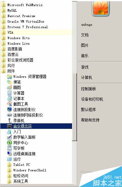 点击“开始”,选择“所有程序”,点选“附件”,选择命令提示符。