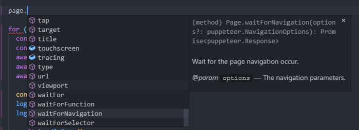 我使用的Typescript,能够获得完整的Puppetter及相关库的API提示,如果你不会TS,只需要将相关的代码换成ES的语法就好了