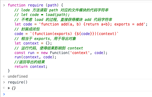 先不考虑模块文件代码的载入过程,假设 require 已经可以从模块文件中读取到代码字符串,那么 require 可以这样实现