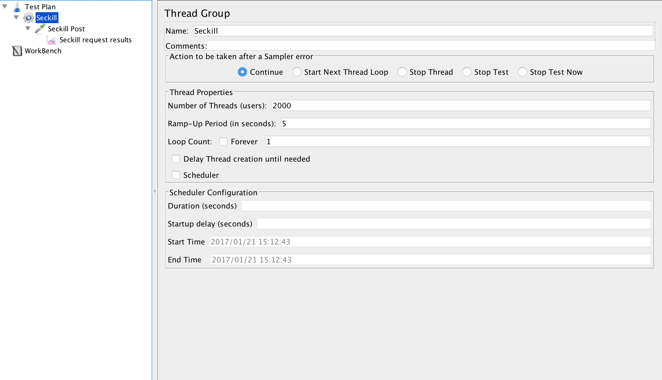 从官网下载一个JMeter的binary包,执行bin目录下的jmeter即可启动,启动后如下图新建一个名为Seckill的Thread Group,并且设置在5s内发起2000次并发请求。