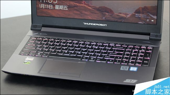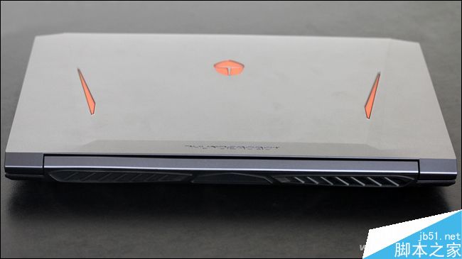 这款产品的A面通过几道脊线有了更为立体的设计感,中间的雷神Logo和两道细长三角装饰条内还隐藏着LED背光灯,开机后可以泛出橙色的背光,煞是好看。