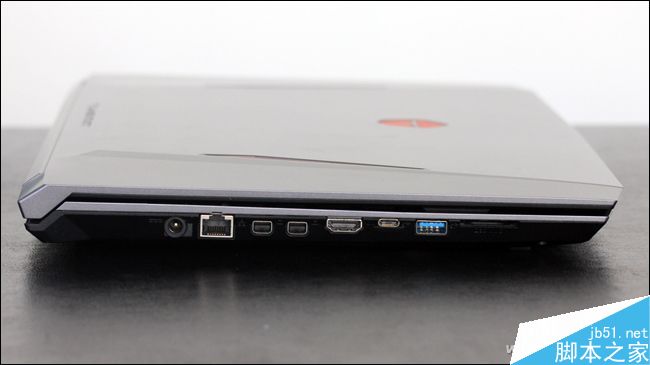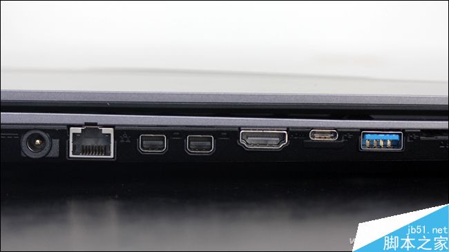 雷神ST Plus的接口种类和数量都非常丰富。机身左侧依次提供了电源孔、RJ45、2个miniDP、HDMI、USB Type-C、USB3.0和读卡器。