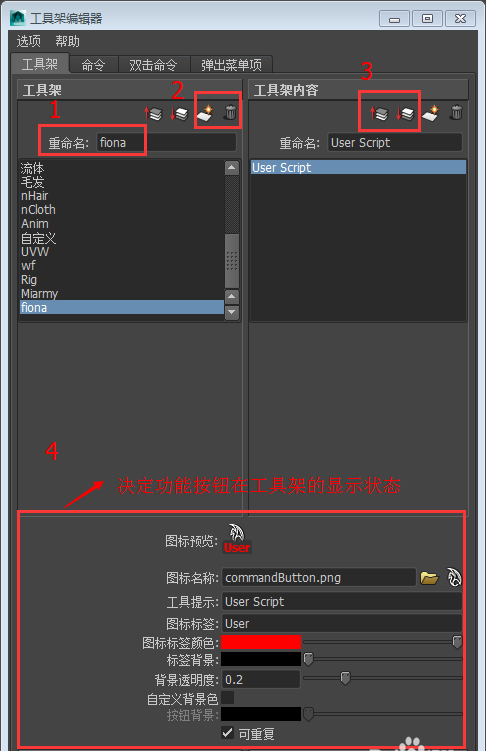 1、单击新建按钮,工具架内容选项中出现了User Script