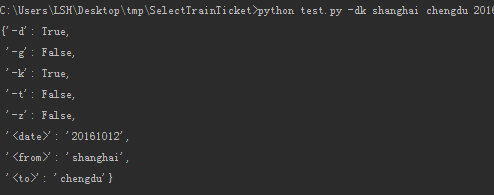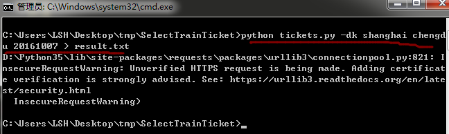 在cmd命令行执行:python tickets.py -dk shanghai chengdu 20161007 > result.txt