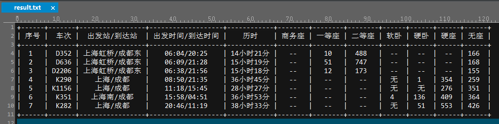 意思是:查询 上海--成都 2016.10.07 的D和K开头的列车信息,并保存到 result.txt文件中;下面就是result.txt文件中的结果: