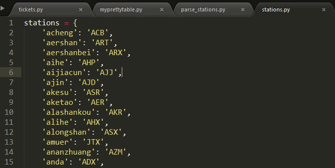 就会在当前目录下得到stations.py文件,文件中就是站点名字和简称,在stations.py文件中加入"stations = "这样就是一个字典,方便后面的取值,下面就是stations.py文件的内容: