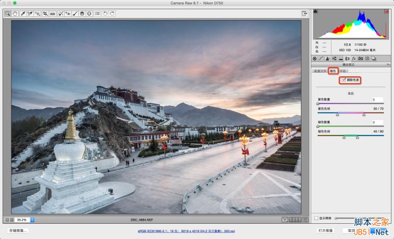 在CameraRaw里的最后一步是矫正畸变和暗角(当然也可以第一步就矫正),这里勾选“启用镜头配置文件矫正”,根据需求调整畸变和暗角的矫正量,这里我为了突出画面中心的布达拉宫,稍微保留了一点暗角。