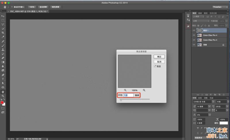 最后一步是使用高反差图层的方式锐化,我们在Photoshop盖印图层,对它执行滤镜>其他>高反差保留,一般调整数值为1或2即可。
