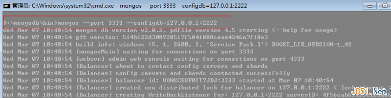 这里要注意的是我们开启的是mongos,不是mongod,同时指定下config服务器,这里我就开启D盘上的mongodb,端口3333。
